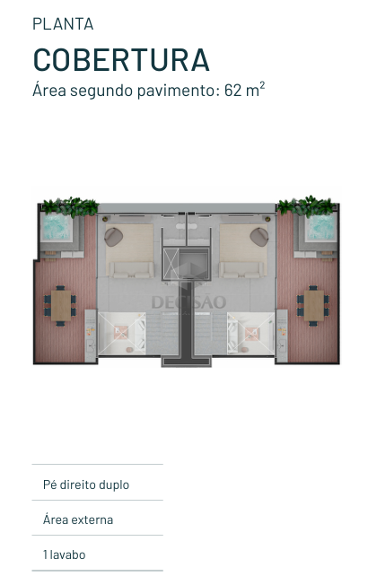 Cobertura: 1º Piso: Sala ampla (em porcelanato), 02 quartos (em laminado), sendo 01 suíte, banho social, cozinha americana, área de serviços.