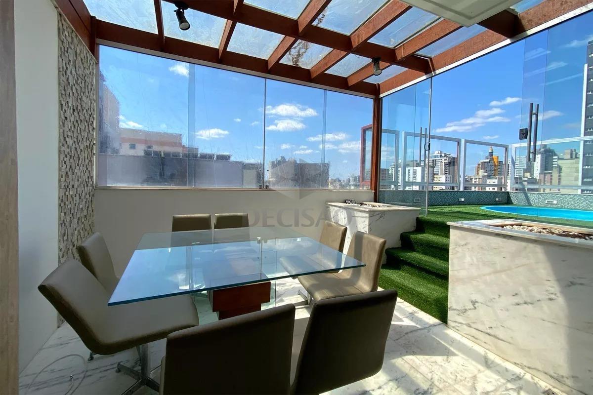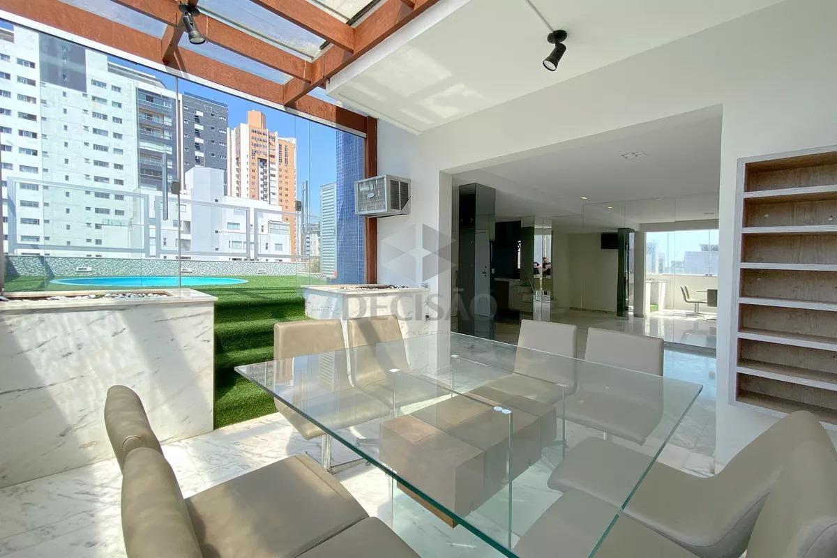 Cobertura Top House: 1º Piso: Sala ampla com ar-condicionado, lavabo, cozinha planejada com bancadas em granito, armários, área de serviços independente, espaço gourmet com jacuzzi, área descoberta.