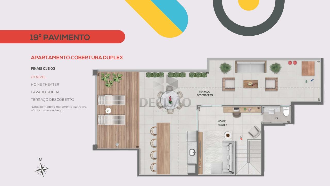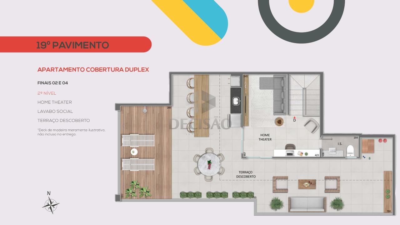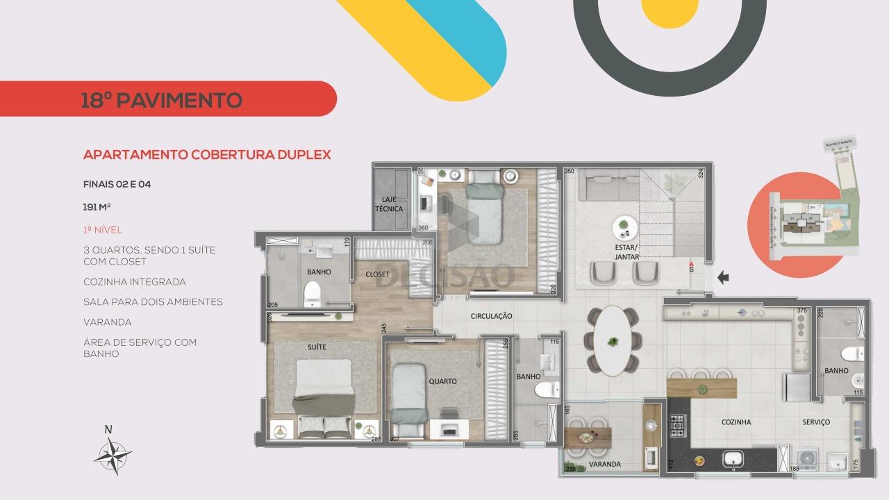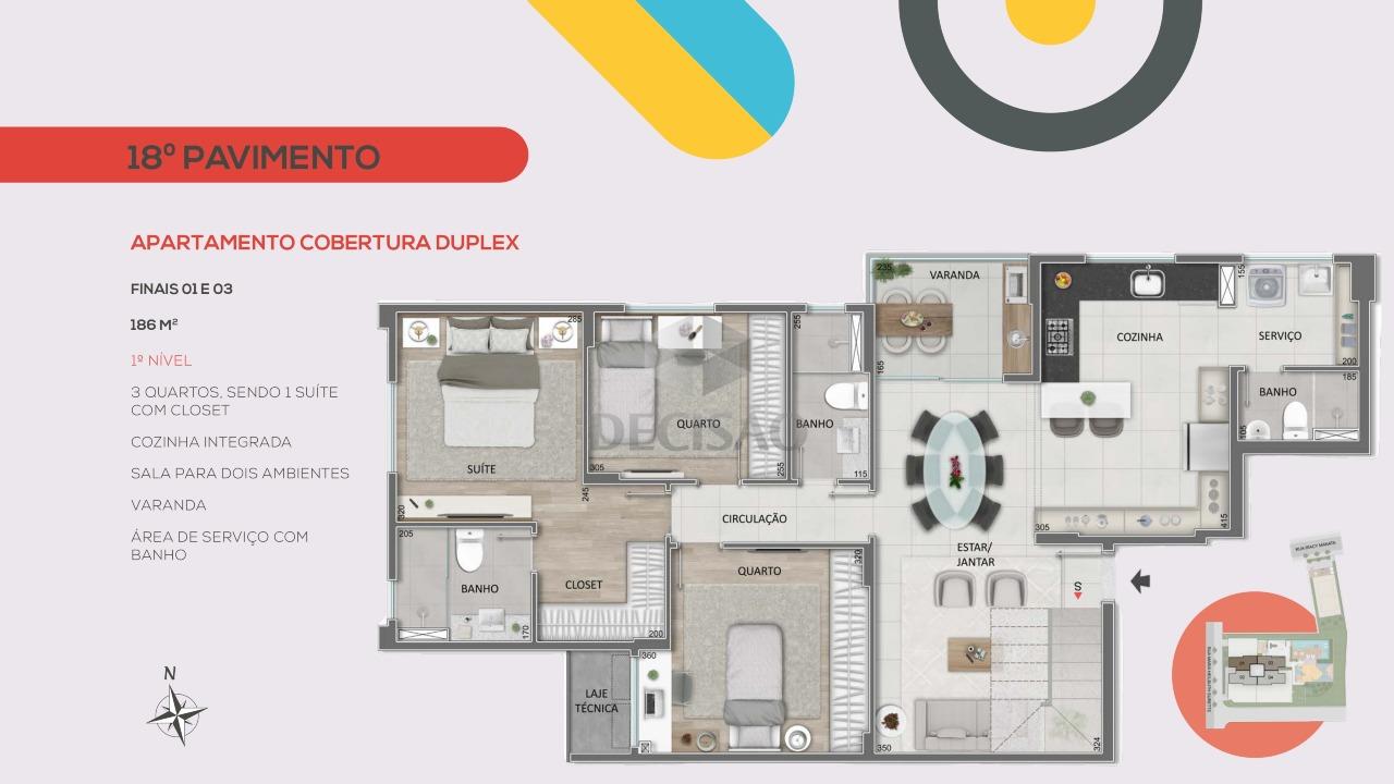 Cobertura: 1º Piso: Salão para 02 ambientes, varanda, 03 quartos, sendo 01 suíte (com closet - vão), banho social, cozinha ampla, área de serviços, banho de empregada.