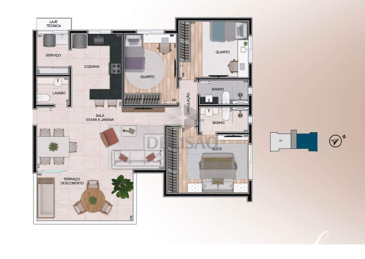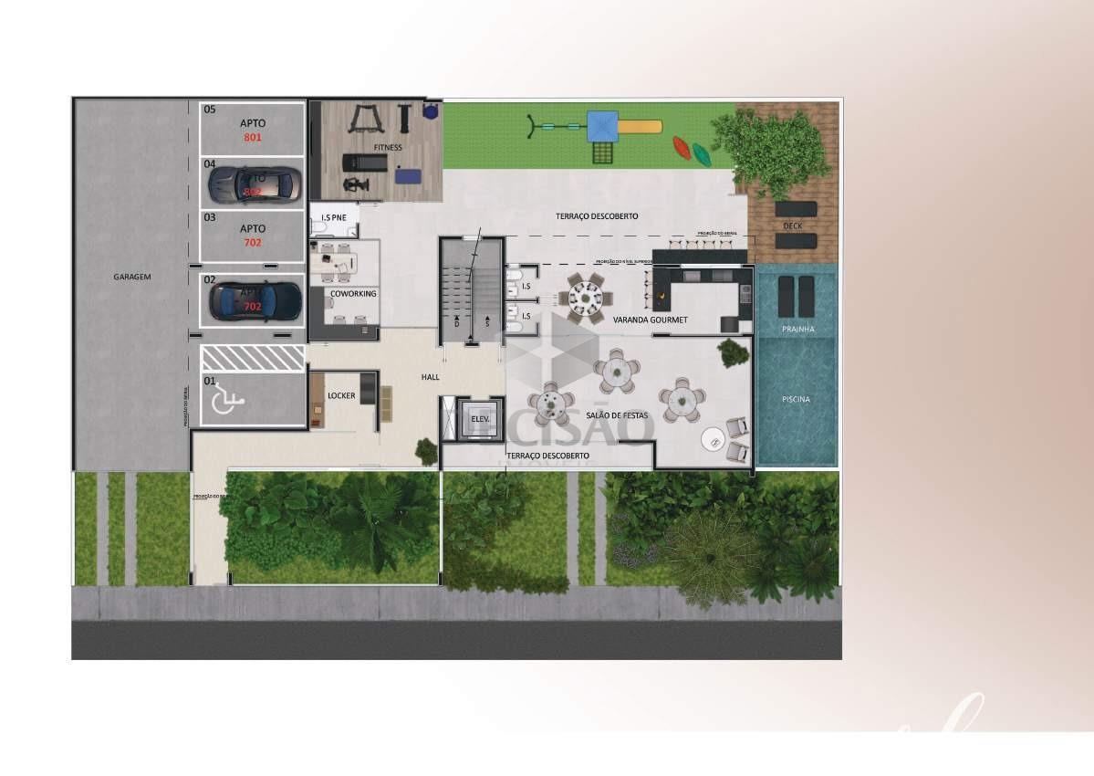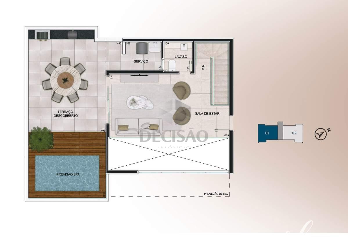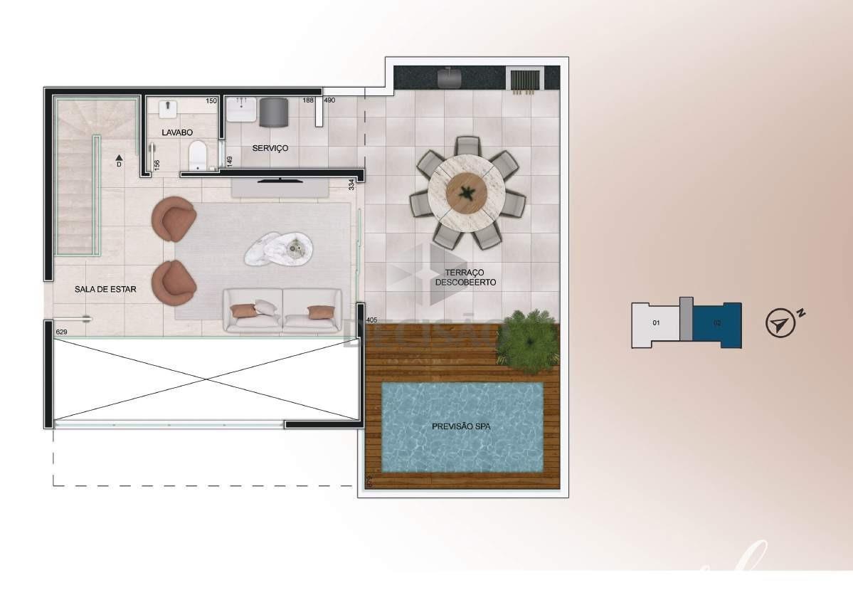 2º Piso: Salão amplo, lavabo, amplo terraço livre, bancada gourmet, área de serviços separada.