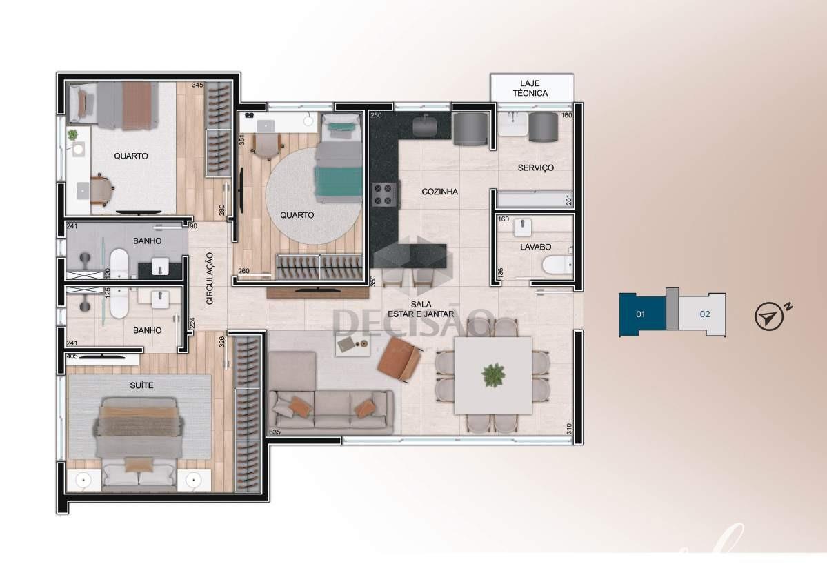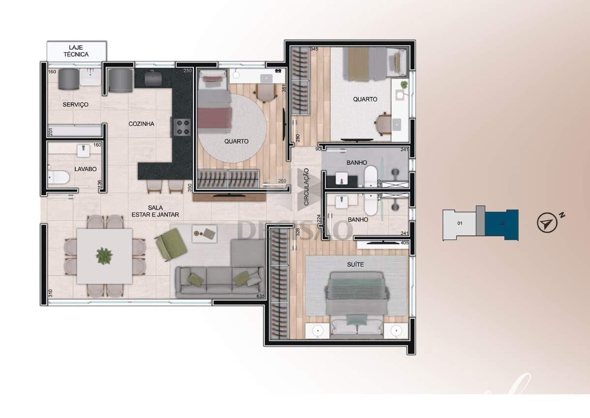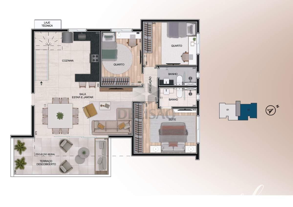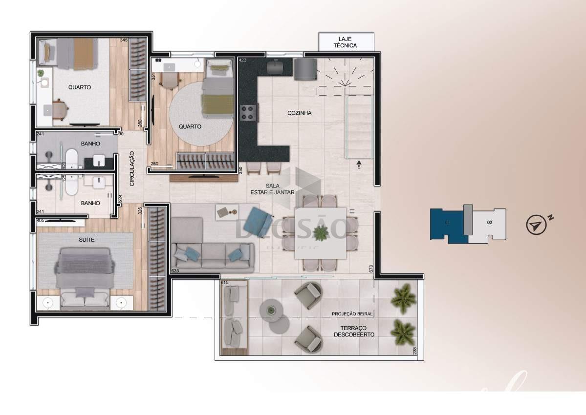 2º Piso: Salão amplo, lavabo, amplo terraço livre, bancada gourmet, área de serviços separada.