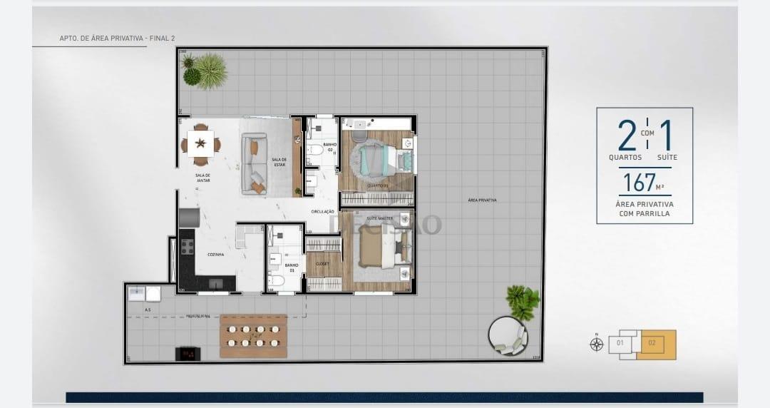 Apto: Excelente, sal para 02 ambientes, 02 quartos, sendo 01 suíte (com closet), banho social (com toucador), cozinha estilo americana e área de serviços.