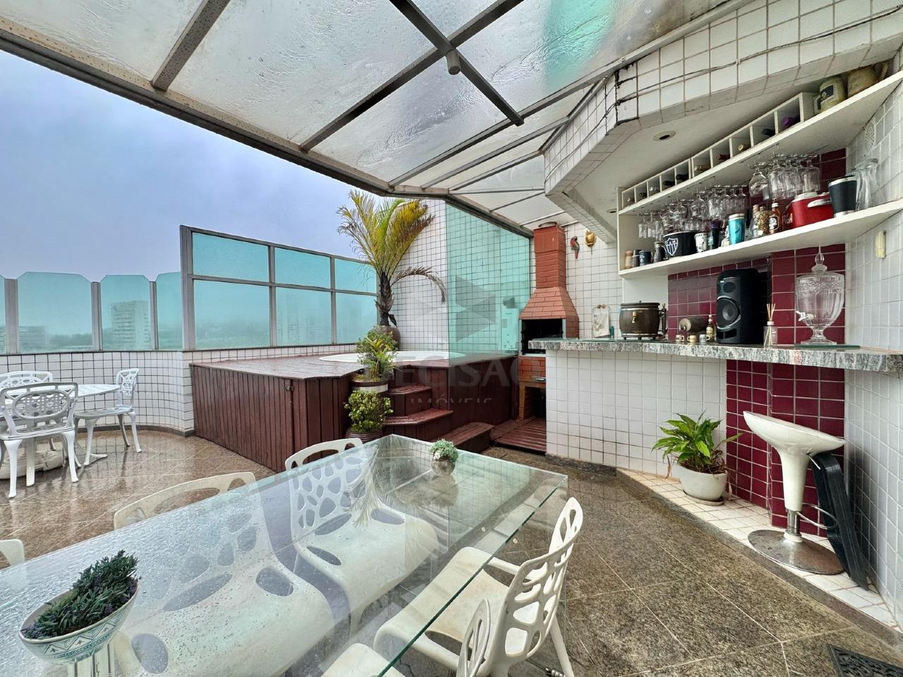 Parte externa: área livre, espaço gourmet com churrasqueira, jacuzzi, vista.