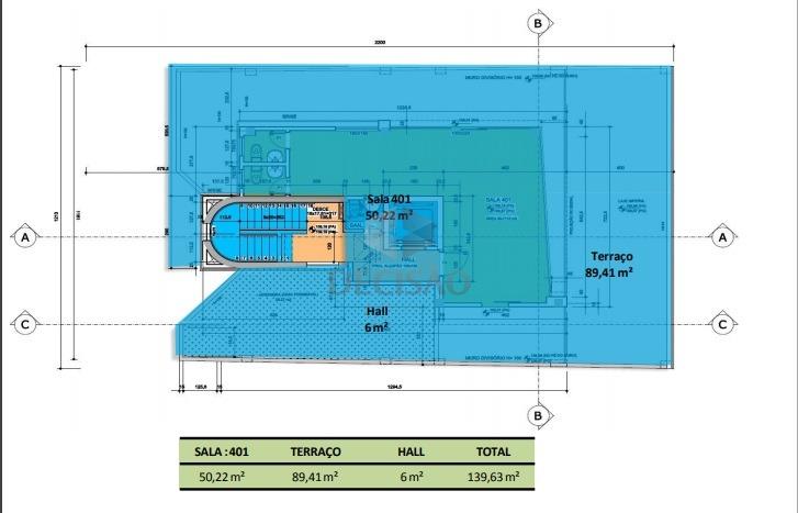 Sala 401 - Com 50,22m² de área interna, mais 89,41m² de terraço, totalizando 139,63m2 mais 6m2 de hall, totalizando 145,63m2
