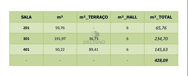 Sala 301 - Com 191,97m² de área interna mais 36,73m² de terraço - totalizando 228,70m² mais 6m2 de hall, totalizando 234,70m2.