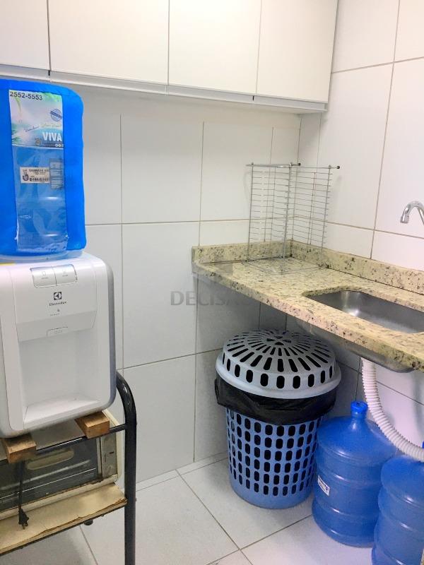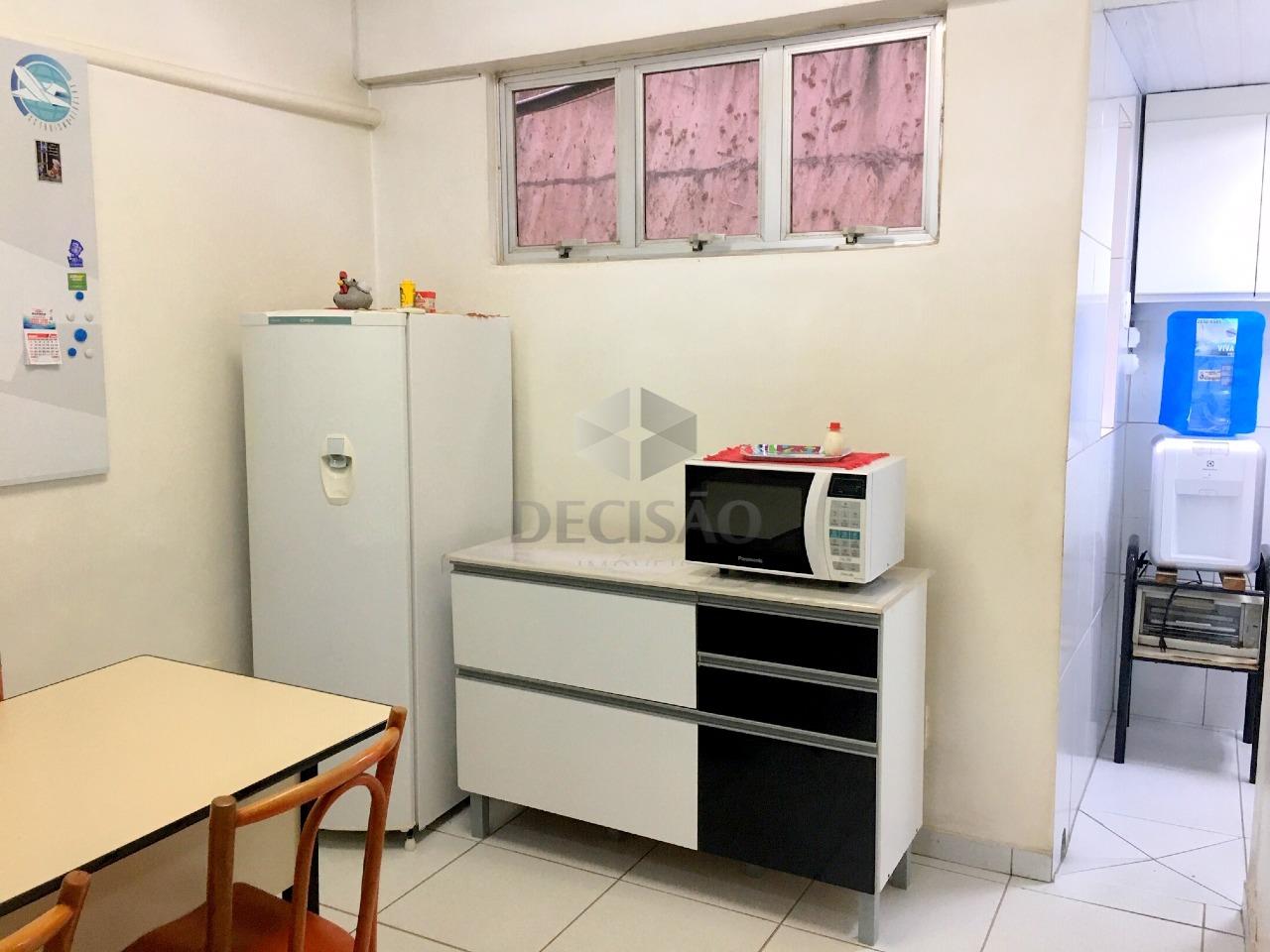Sala ampla no Santa Efigênia, com salão em porcelanato, quatro banhos, mobiliário planejado, ar-condicionado, cozinha com armários e sala para arquivos. Localizada em prédio revestido em granito e textura, com porteiro e uma vaga livre de garagem.