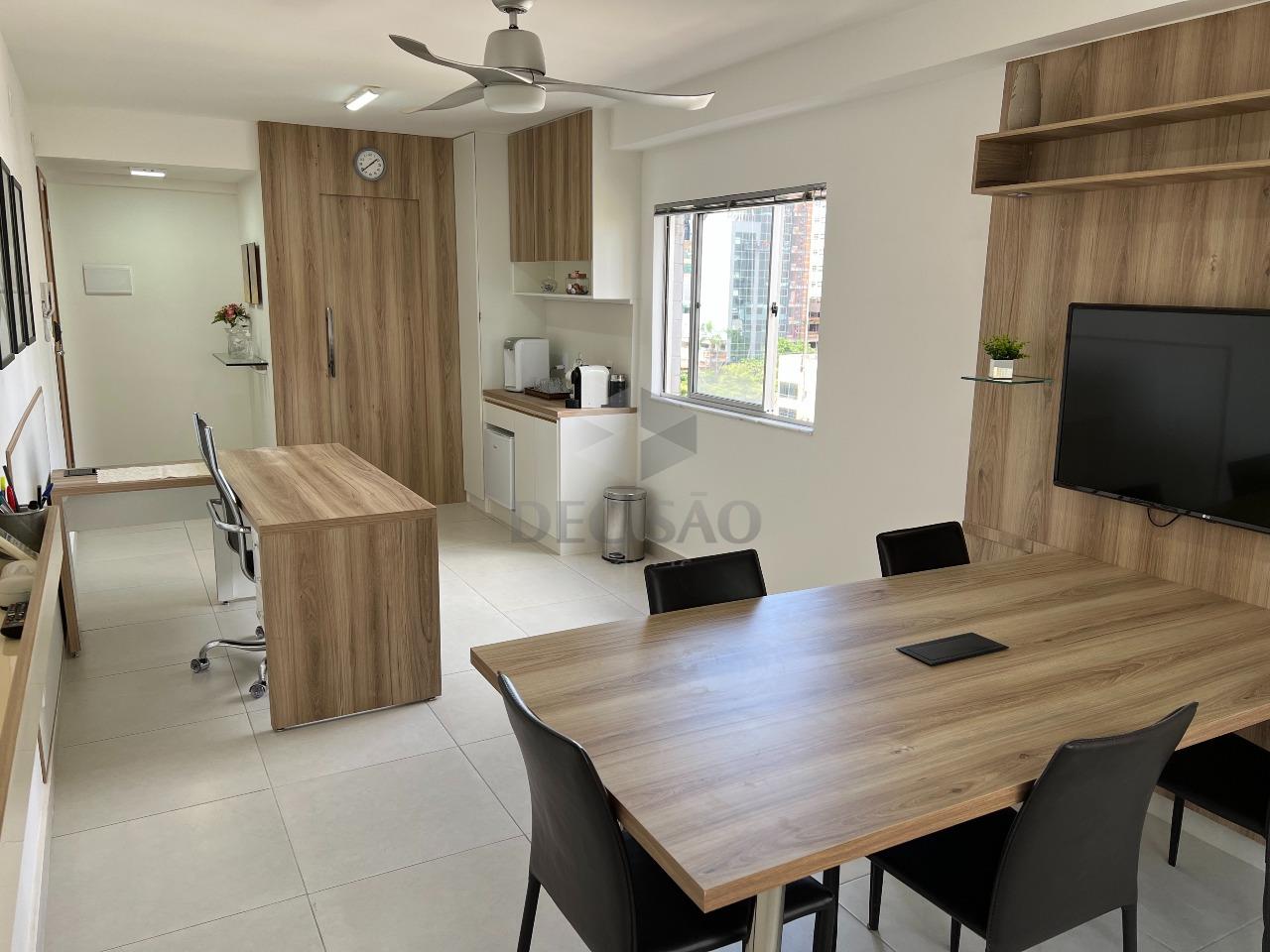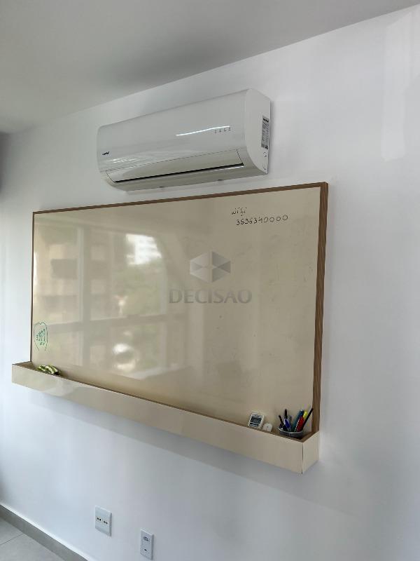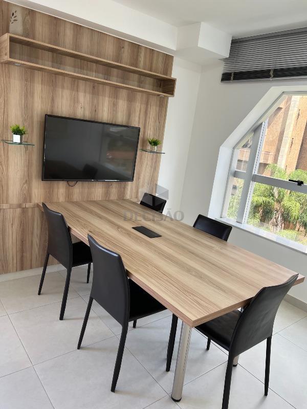 Sala com armários planejados, bancadas para trabalho, mesa para reuniões, ar-condicionado, iluminação de led, lavabo com bancada de mármore.